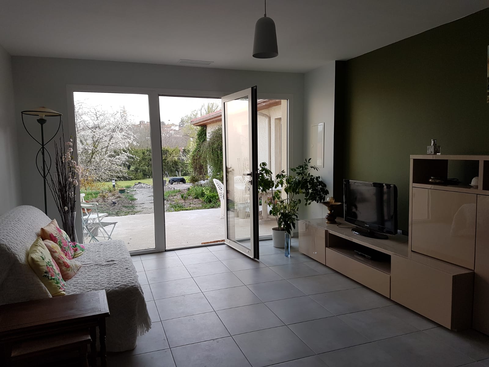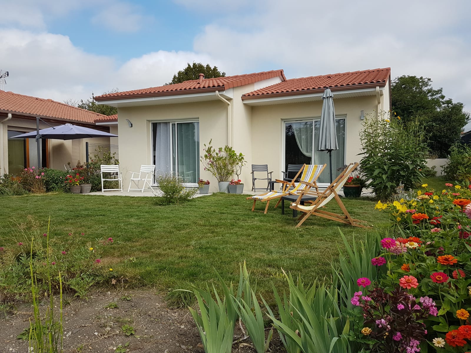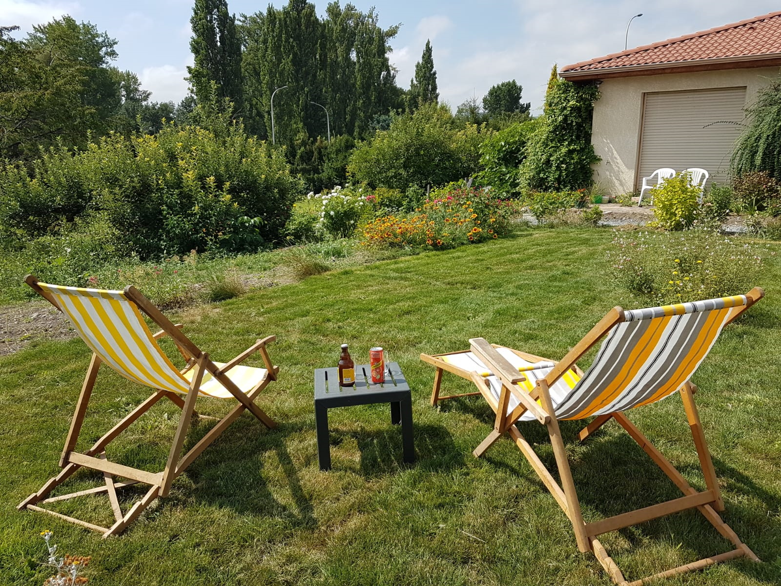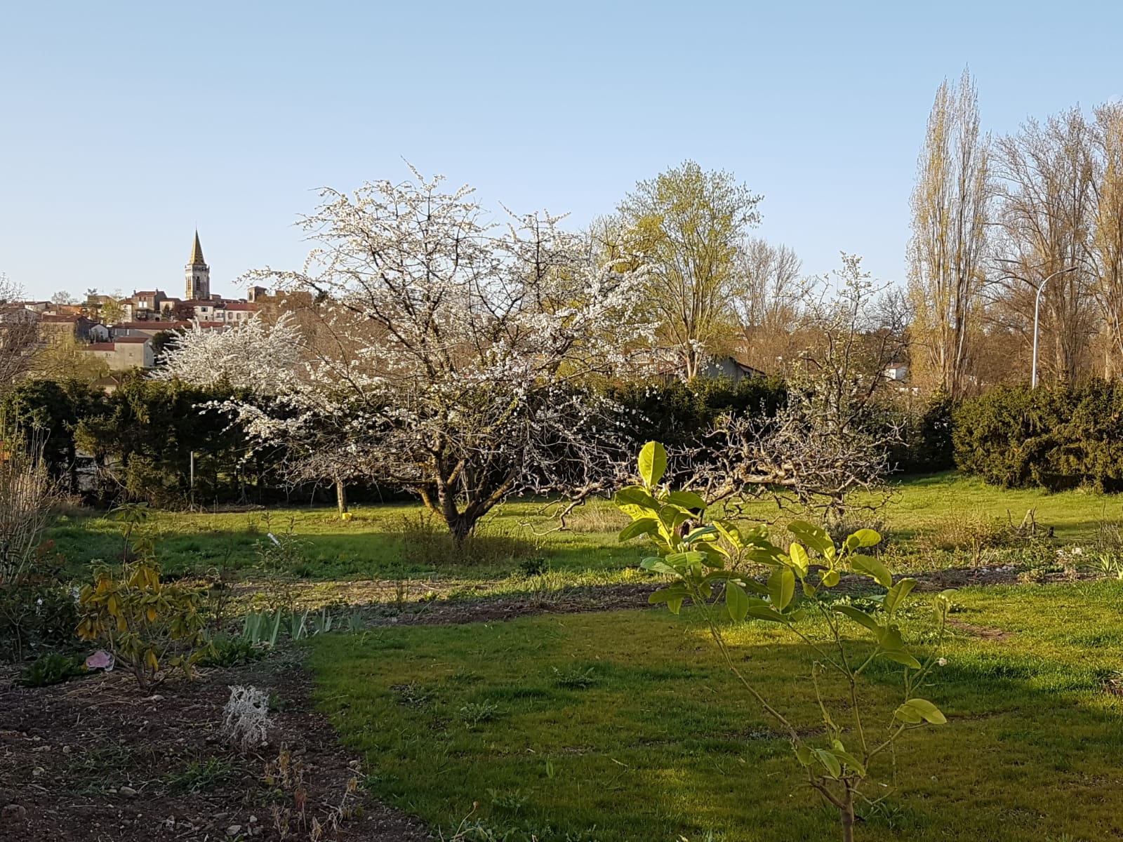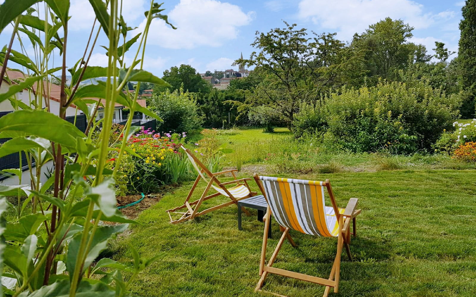 Le jardin, en cours de réaménagement, il se compose d'un espace engazonné autour d'arbres fruitiers et d'un espace détente : fléchettes, badminton.