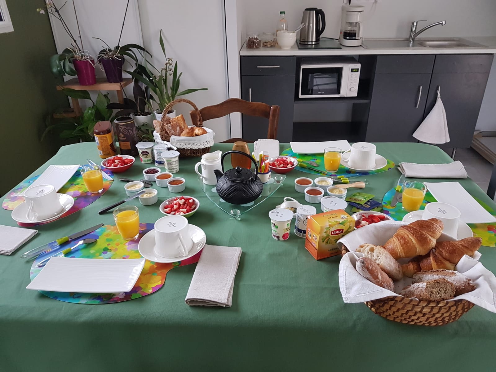 Le petit déjeuner est servi tous les matins dans le salon ou sur la terrasse. Vous y dégusterez notamment des fruits, céréales, viennoiseries, confitures maison, jus de fruit, thé, café ou chocolat.